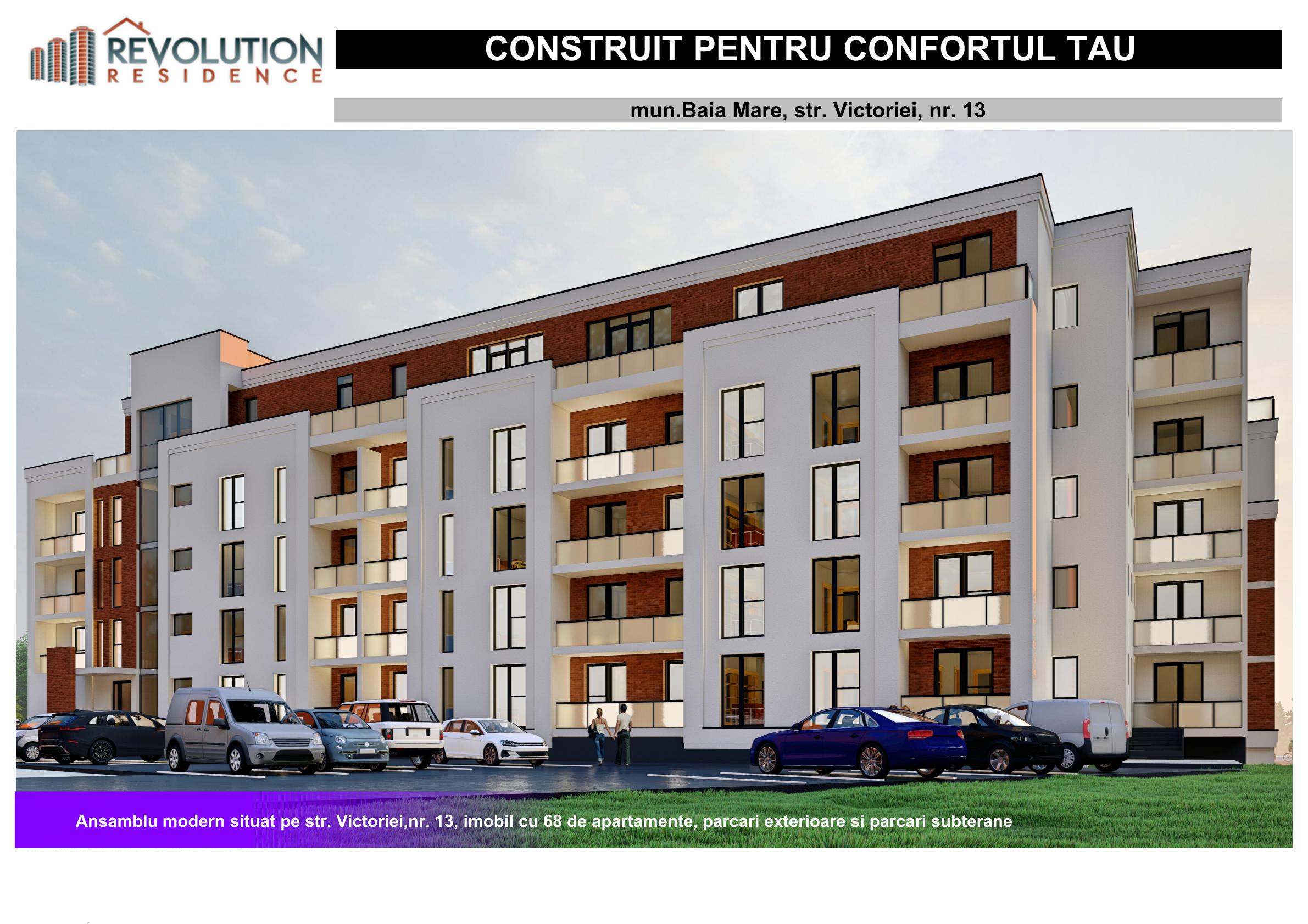 Noul complex Rezidential Victoriei 13, Baia Mare un proiect marca Revolution Residence vine in intampinarea dvs. cu apartamente noi, la preturi accesibile. Va propunem spre vanzare ultimul apartament cu 3 camere, avand o suprafata de 93.62 mpc plus balcon in suprafata de 3.89 mpc. Detalii proiect: - imobil locuinte D+P+ 3E+ER si cuprinde un total de 79 apartamente - locatie : strada Victoriei 13, Baia Mare -pozitionare excelenta, acesta fiind amplasat intr-o zona linistita de apartamente -acces foarte usor la mijloacele de transport in comun, scoli, gradinite, facultate, supermarket-uri, restaurante -standarde ridicate de siguranta si calitate -finisaje moderne -parcare subterana si curte interioara supravegheata video 24h/24h -parcare exterioara -lift interior -zone verzi, facilitati la indemana Achizitioneaza un apartament din complexul rezidential Victoriei 13 si ai design gratuit pentru amenajarea camerei de baie. Pret 115.000 Euro. Pretul apartamentului include TVA 5%, care se va aplica conform normelor in vigoare. Pentru mai multe detalii, ne puteti contacta la numarul de telefon 0362.803.355. / 0774.049.796